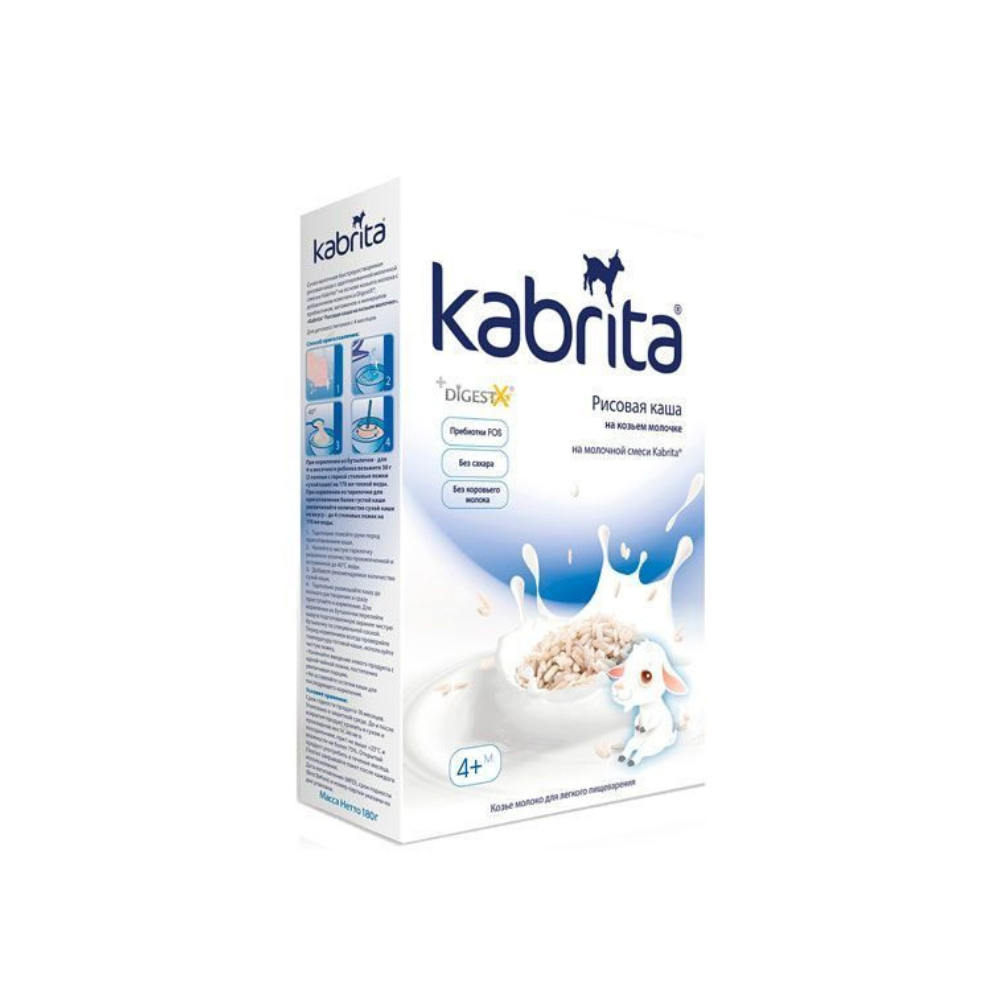 - Состав: Рисовая мука, адаптированная смесь Kabrita с козьим молоком, пребиотики