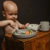 - Тарелка и миска с присосками: крепятся к столу или подносу стульчика для кормления, предотвращая случайное опрокидывание.