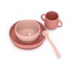 - 4-предметный комплект: включает в себя не скользящую тарелку, миску, чашку и мягкую ложку для малышей.