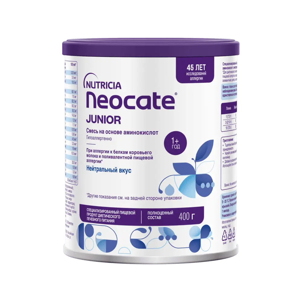Neocate Junior — это специализированная гипоаллергенная смесь на основе аминокислот, предназначенная для детей старше 1 года с пищевой аллергией и нарушениями пищеварения.
