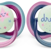 На изображении представлены пустышки с ночными тематическими рисунками, такими как улыбающаяся звезда и надпись «dreams». Эти успокаивающие дизайны создают уютную атмосферу для сна вашего малыша. Яркие, но мягкие цвета и светящиеся в темноте элементы добавляют чувство спокойствия и комфорта.