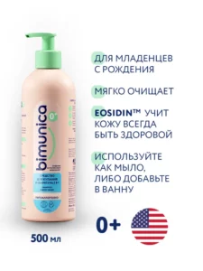 Bimunica mahsuloti chaqaloq terisi va sochlari uchun mukammal, yumshoq parvarish yaratadi. Tarkibidagi Glucotain Flex sirtfaol modda bo‘lib, tozalash jarayonini qulay va xavfsiz qiladi. Pantenol va chamomile hydrosol terini yumshatish va oziqlantirish uchun ishlatiladi.