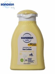 Sanosan Baby SPF 50 losoni mineral filtrlarga asoslangan bo‘lib, quyosh nurlarini aks ettiradi va terini ishonchli himoya qiladi. E vitamini hujayralarni oksidlanishdan himoya qiladi, pantenol esa terini tinchlantirib, namlikni tiklaydi. Loson tez shimiladi, terida oq iz qoldirmaydi va allergiya chaqirmaydi.