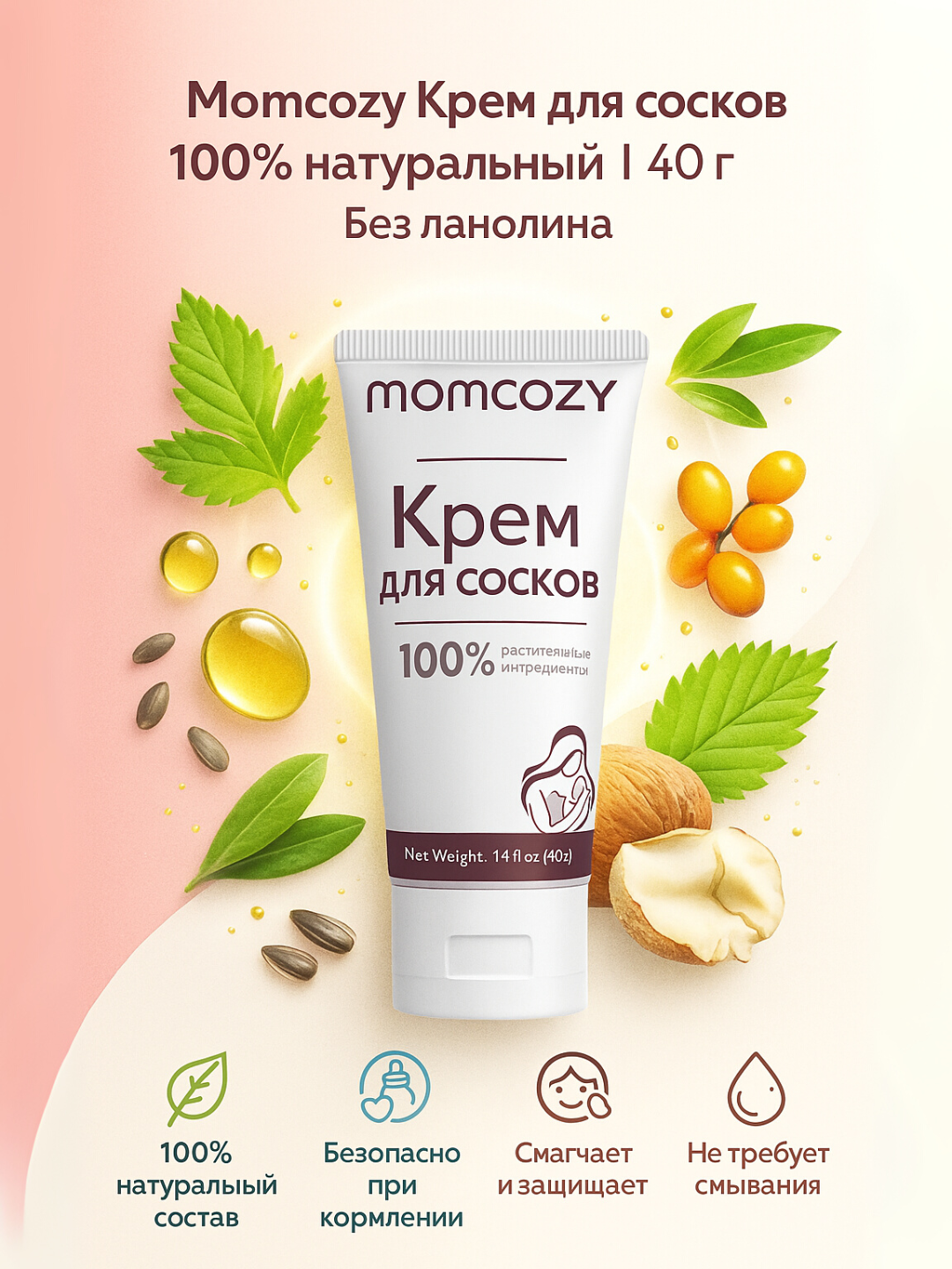 💖 Momcozy ko‘krak uchi kremi emizish davrida terini ehtiyotkorlik bilan parvarishlash uchun yaratilgan. 6 ta o‘simlik komponentidan iborat noyob formula terini chuqur namlaydi, oziqlantiradi va himoya qiladi, uni yumshoq va sog‘lom saqlaydi. Krem ona va bola uchun mutlaqo xavfsiz bo‘lib, emizishdan oldin yuvishni talab qilmaydi 🍼.