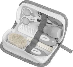 Tirnoq qirqish qaychisi, taroq, soch cho‘tkasi, aspirator, termometr, burun tozalagich, tish chiqarish halqasi va boshqa gigiyena vositalari — hammasi bir komplektda. Alohida-alohida xarid qilish shart emas.